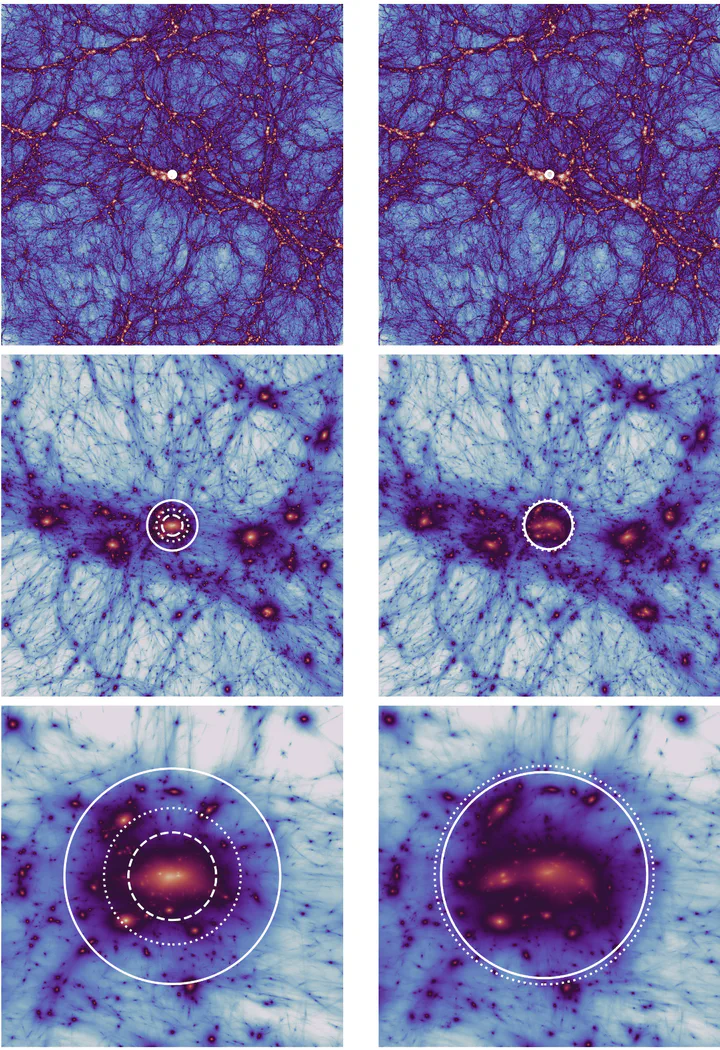 Zoom-ins of the same halo forming in two cosmologies that share the linear density field (see top row), but vary in their recent growth history. The mass assigned to the halo depends on cosmology due to 1) the slightly different density profiles and 2) cosmology dependence of halo mass definitions, illustrated in the white circles.Abstract